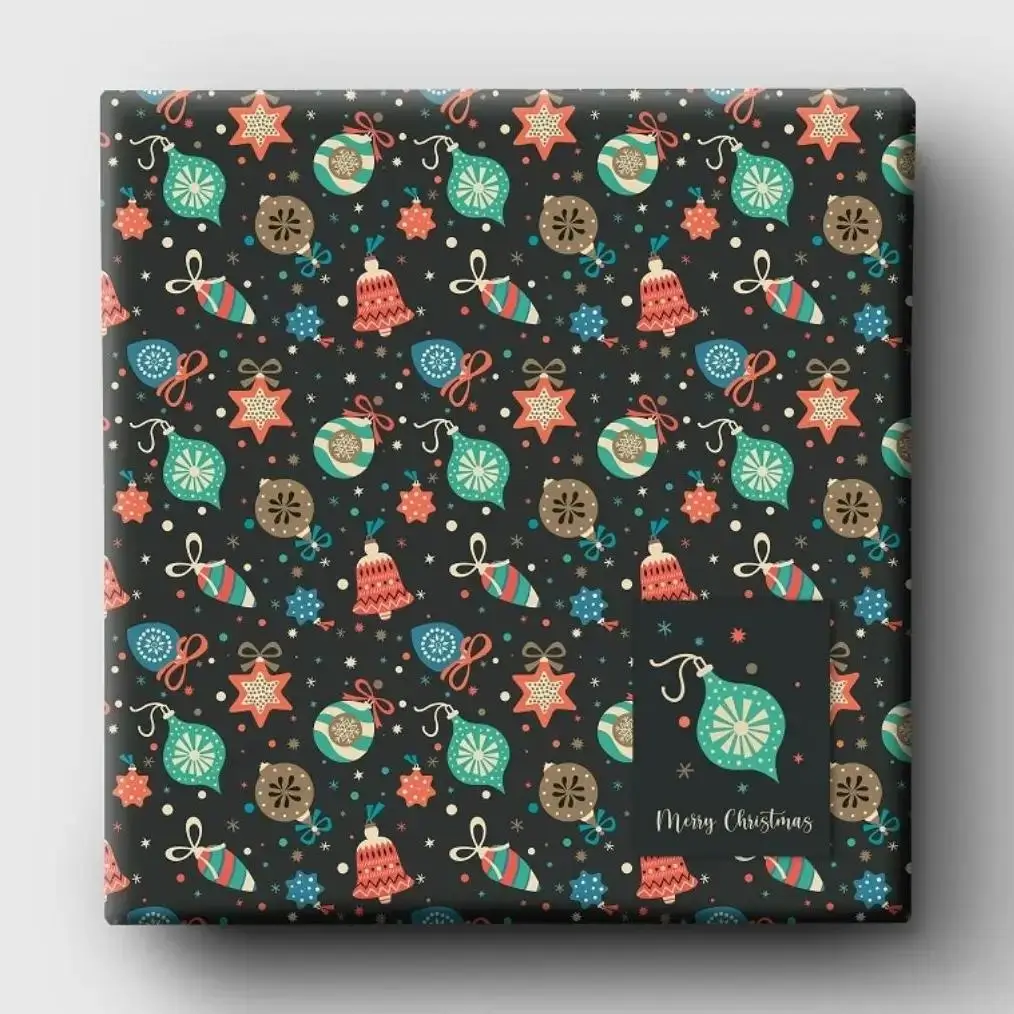 Wrap your gifts in festive elegance with our Bauble Noire Wrapping Paper, a stylish Christmas design featuring colourful baubles, stars, bells, ribbons and ornaments on a rich black background. Perfect for modern, luxury and traditional gifting, this paper makes every present look premium and special.